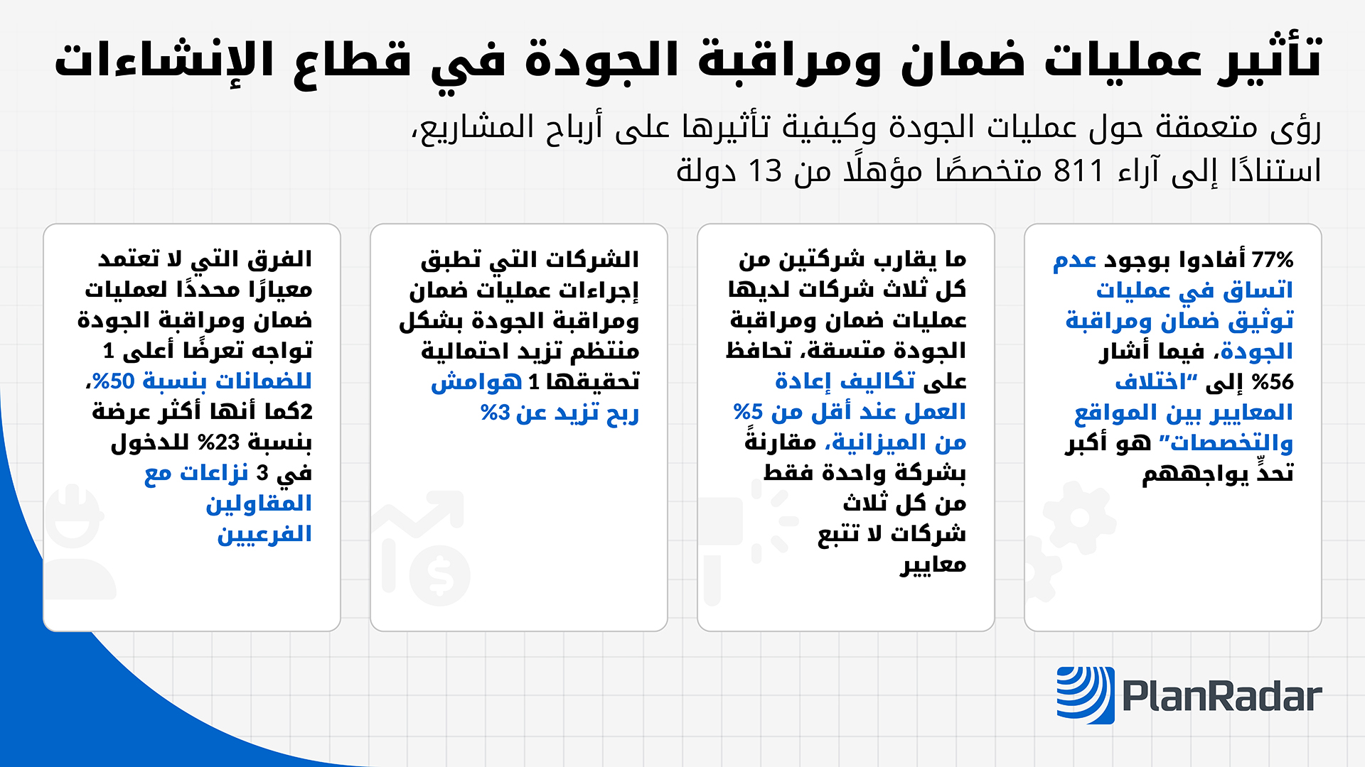 ووفقًا لتقرير تأثير عمليات ضمان ومراقبة الجودة في البناء، فإن 77٪ من الشركات تعاني من عدم الاتساق في التوثيق، مما يؤدي إلى ارتفاع معدلات إعادة العمل وتزايد النزاعات مع المقاولين.
