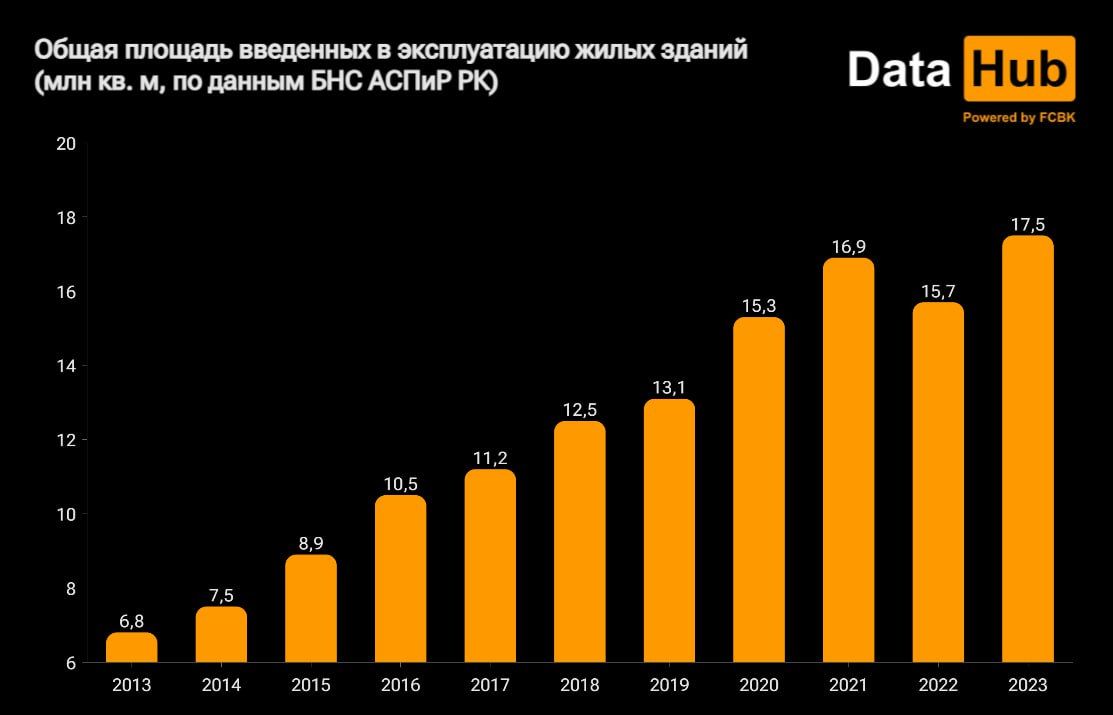 • В 2023-м году объем строительных работ увеличился на 12% по сравнению с 2022-м, до 17,5 млн кв.м. Среди регионов абсолютные лидеры – Астана и Алматы, на которые приходится 36% от строек страны. Рост рынка в денежном исчислении составил 12,6% — почти до 6 трлн тенге. При этом количество сделок упало более чем на 40%.